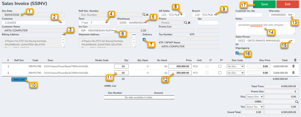 - Pilih pelanggan (bisa menggunakan kode atau nama)
