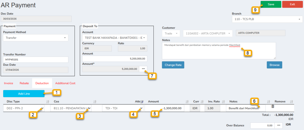 - Pilih kode biaya yang sehubungan dengan pembayaran piutang