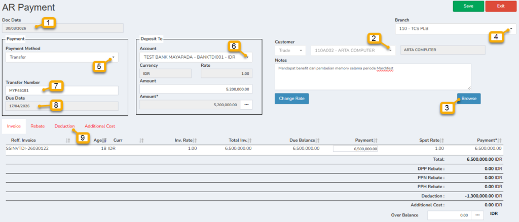 AR Rebate (Account Receivable Rebate) adalah potongan atau insentif yang diberikan kepada pelanggan berdasarkan pencapaian volume pembelian tertentu, pembayaran tepat waktu, atau program loyalitas, dan dicatat dalam akun piutang usaha (AR). Rebate biasanya tidak langsung dikurangkan dari harga jual, melainkan diberikan di akhir periode sebagai kredit atau pengurang saldo piutang.