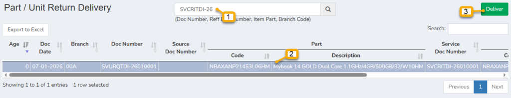 - Buka menu di Service – Service Proces – Part Unit Return Delivery