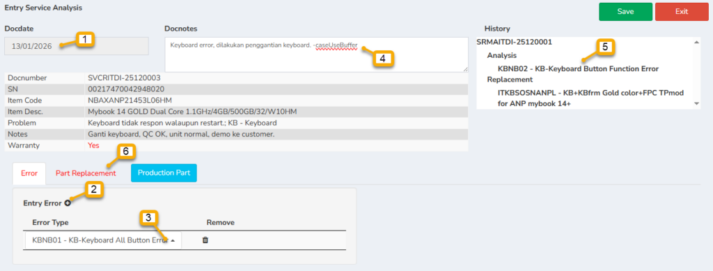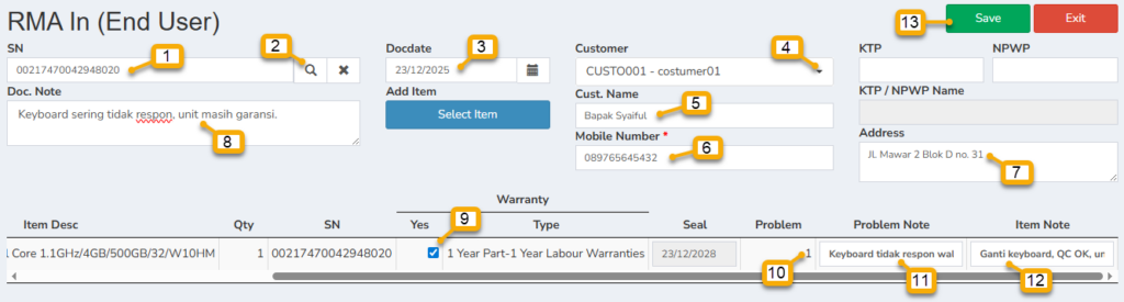Pada tanggal 23 Des 2025, Bapak Syaiful mendatangi service center untuk melakukan perbaikan Notebook karena keyboard nya bermasalah sering tidak respon walaupun sudah di restrat ulang.