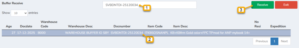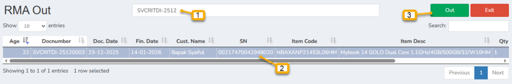 3. Tekan icon kaca pembesar untuk mencari SN, jika valid item otomatis muncul dan ditambahkan ke tabel.