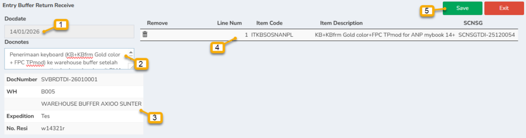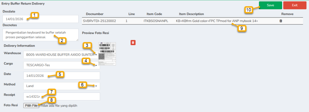 10. Tekan tombol Save untuk menyimpan transaksi buffer delivery.