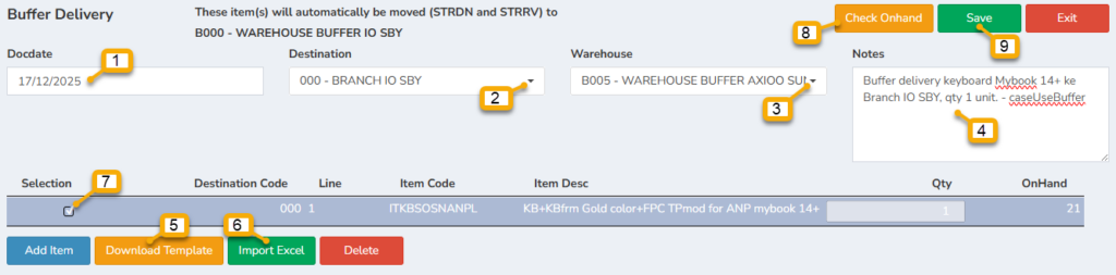 5. Tulis keterangan pada kolom Notes mengenai buffer delivery (contoh: buffer delivery keyboard Mybook 14+ ke Branch IO SBY, qty 1 unit, case use buffer).