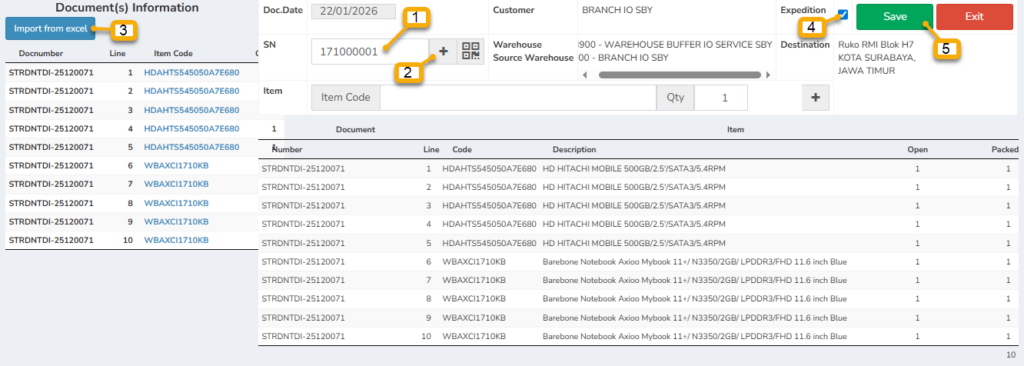- Bisa menambahkan SN barang dengan menggunakkan import dari file Excel yang didalamnya tercatat SN dan kode barang.
