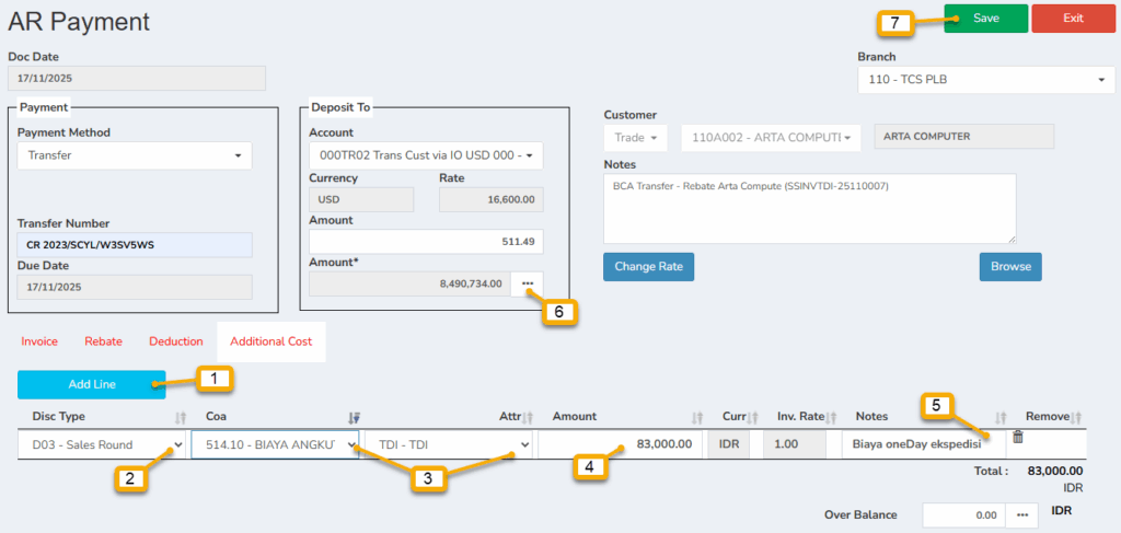 1. Klik ‘Add Line’ untuk mencatat biaya tambahan