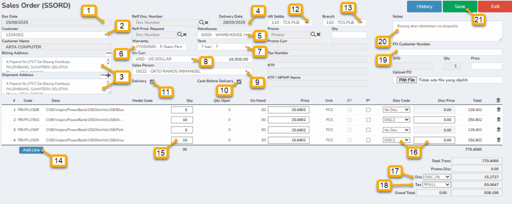 15. Pilih sales yang bertanggung jawab atas transaksi.