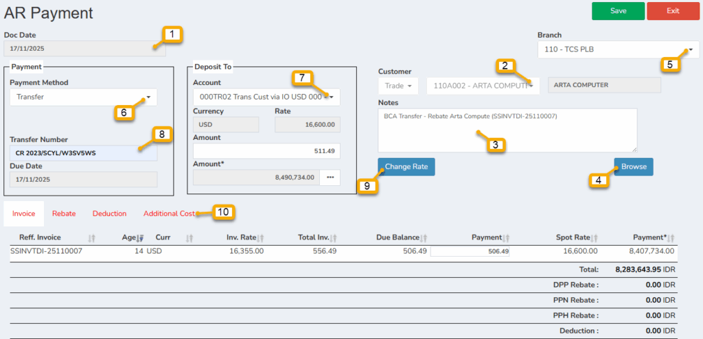6. Klik icon ‘…’ untuk menampilkan total transaksi penerimaan dana atas pembayaran piutang pelanggan