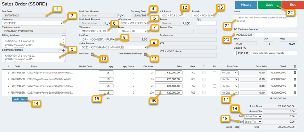 - Tulis nomer dokumen kesepakatan (order dan sebagainya) yang diperoleh dari pelanggan